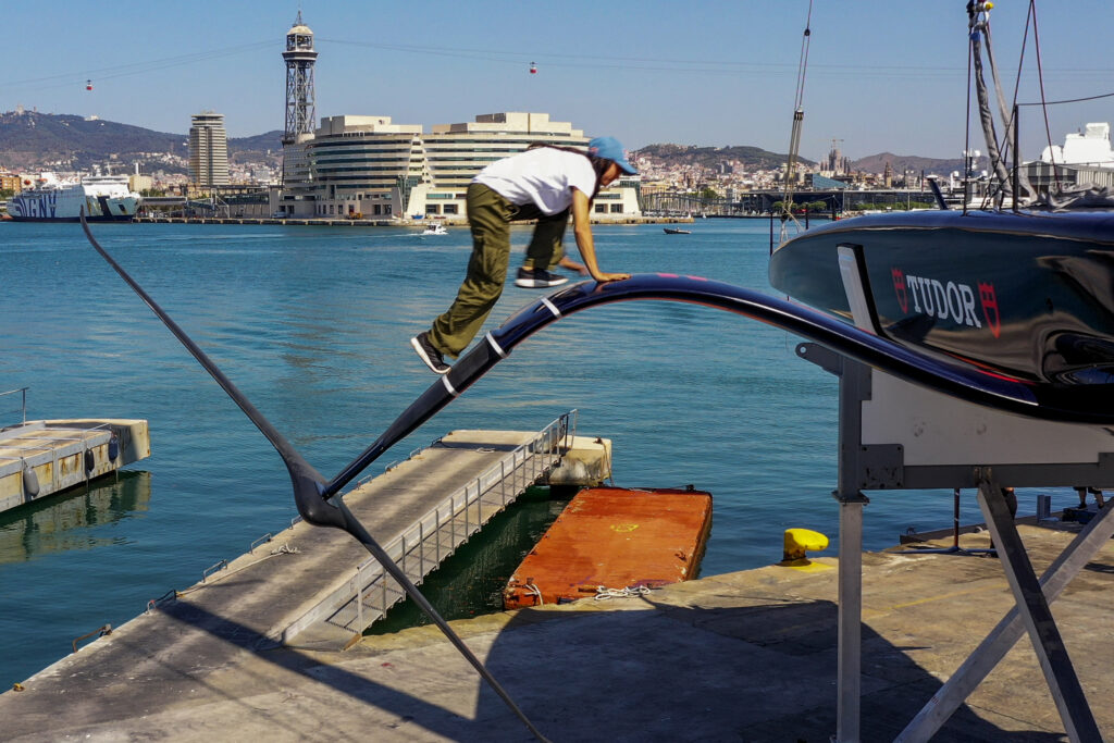 The training vessel was unveiled dockside in Barcelona. Alceo Bertarelli, son of syndicate founder Ernesto Bertarelli, smashed the customary bottle of champagne on the wing as Red Bull sponsored Hazal Nahir, the Turkish parkour athlete, performed tricks on the foil arms. The celebration marked the official launch of this latest Swiss challenge for the America’s Cup.