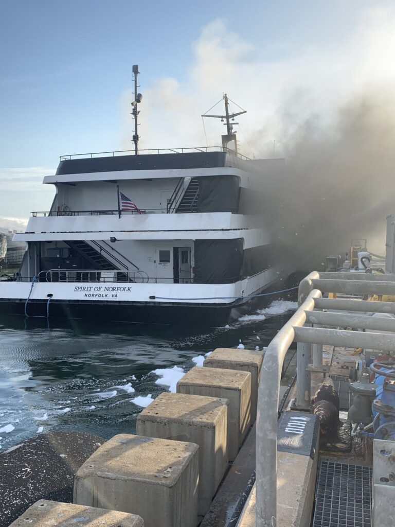 The fire broke out towards the stern of the Spirit of Norfolk cruise boat on the Elizabeth River near Naval Station Norfolk. The Spirit of Norfolk cruise boat was in the water near Pier 3 with over 100 people on board when the fire erupted.