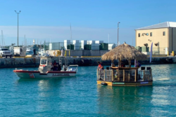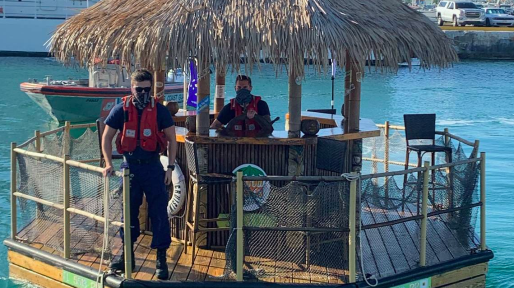According to the Miami Herald the US Coast Guard spotted the boat — basically a bar under a tiki hut on a floating deck — at about 8am Wednesday while on patrol near Fort Zachary Taylor State Park.