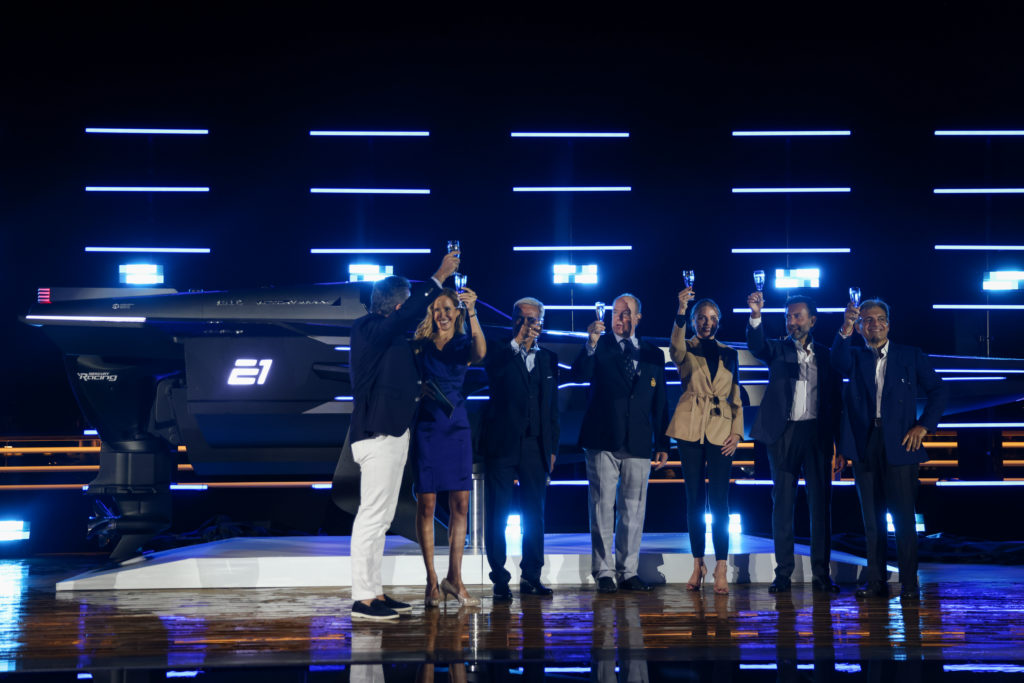 The full-size Racebird model was revealed during a presentation ceremony hosted at the Yacht Club de Monaco, where E1 Series co-founders Alejandro Agag and Rodi Basso were joined by HSH Prince Albert II of Monaco, the boat’s designer Sophi Horne (founder of SeaBird Technologies), Brunello Acampora (founder & CEO of Victory Marine), and Union Internationale Motonautique (UIM) president Raffaele Chiulli.