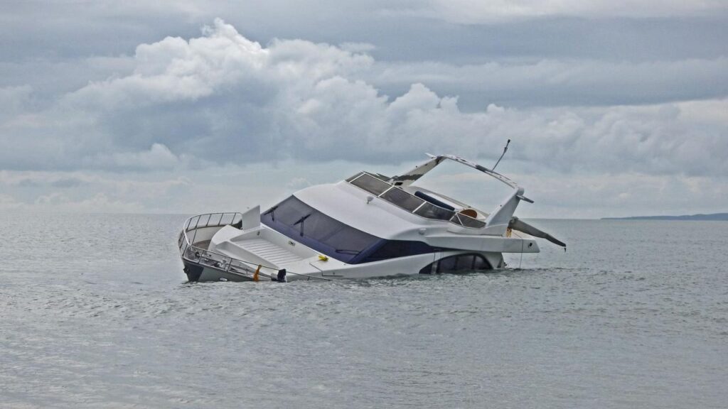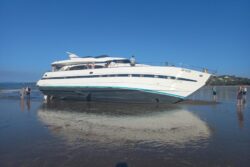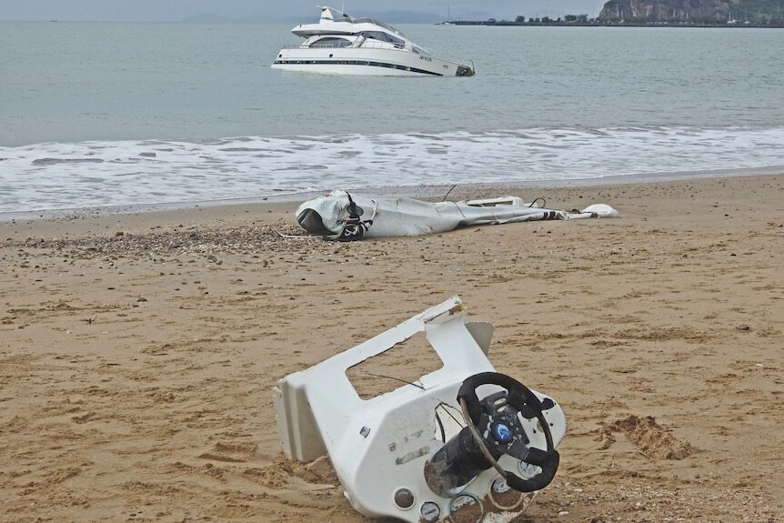The yacht, which is reportedly owned by property mogul Jamie McIntyre, remains semi-submerged in the water, awaiting removal by salvage experts. Debris from the yacht is now washing up on shore.