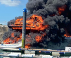 ’85ft of burning fibreglass,’ says one berth holder in the marina. ‘Thank god there was an easterly breeze steering the fumes & fallout away from the marina & when the lines burnt through it drifted away onto the stone pier.