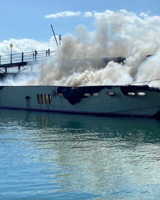The BBC reports eyewitnesses heard a loud bang before the fire, which seems to have spread from the front end, engulfing the entire boat despite the efforts of firefighters. A large column of black smoke spread over the harbour.