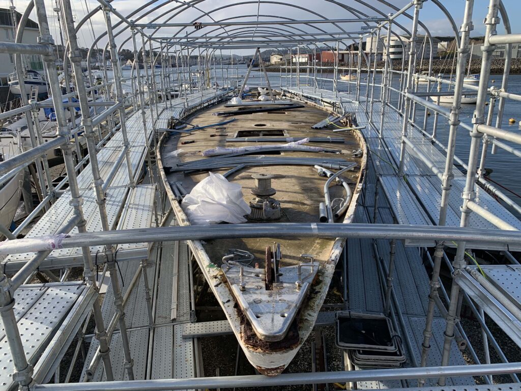 “I saw her in the boatyard at Plymouth. She’s recognisable as she’s a big old boat. She was really stripped down and had no beauty about her. No blue paint, no masts, holes in the side. She laid there for a couple of years.”