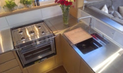 It’s a large and small sink bowl system which aims for maximum functionality in the tight confines of a typical galley.