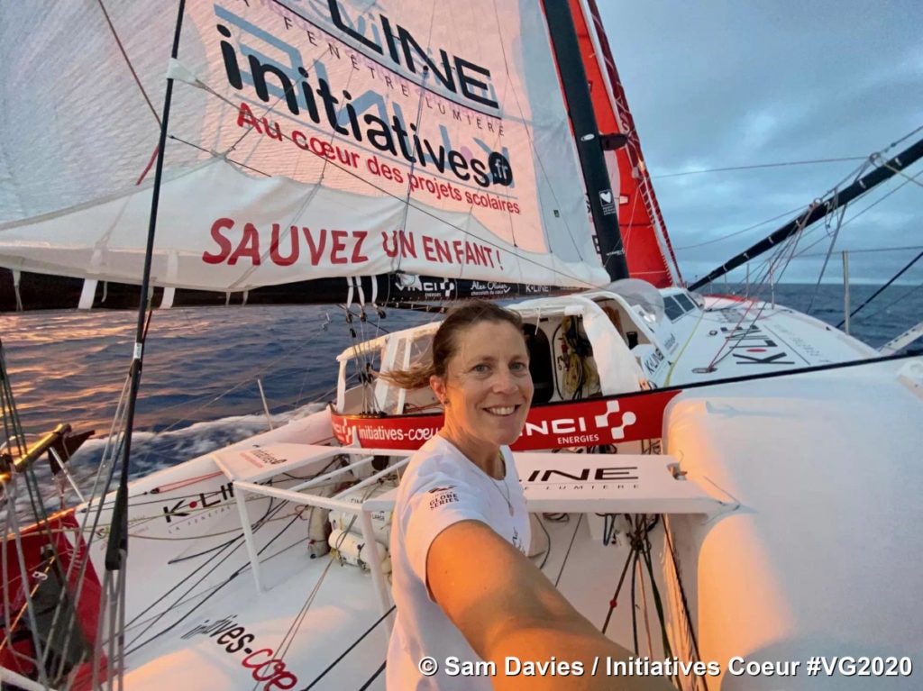 Sam Davies (main image) was one of the first to recognise the opportunity to recover miles by choosing to dive more directly south. She’s pulled back around 100 miles on Louis Burton (Bureau Vallée 2). Davies is now ninth and was still one of the quickest in the fleet yesterday afternoon.