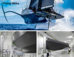 In 2022, Flying Nikka, the world’s first foiling mini maxi, designed by Mills Design and built by King Marine, commissioned Monzó Yacht Painting to carry out all her paint jobs, with a final finish completed in exposed matte carbon prior to her launch and resounding debut on the world’s top race courses.
