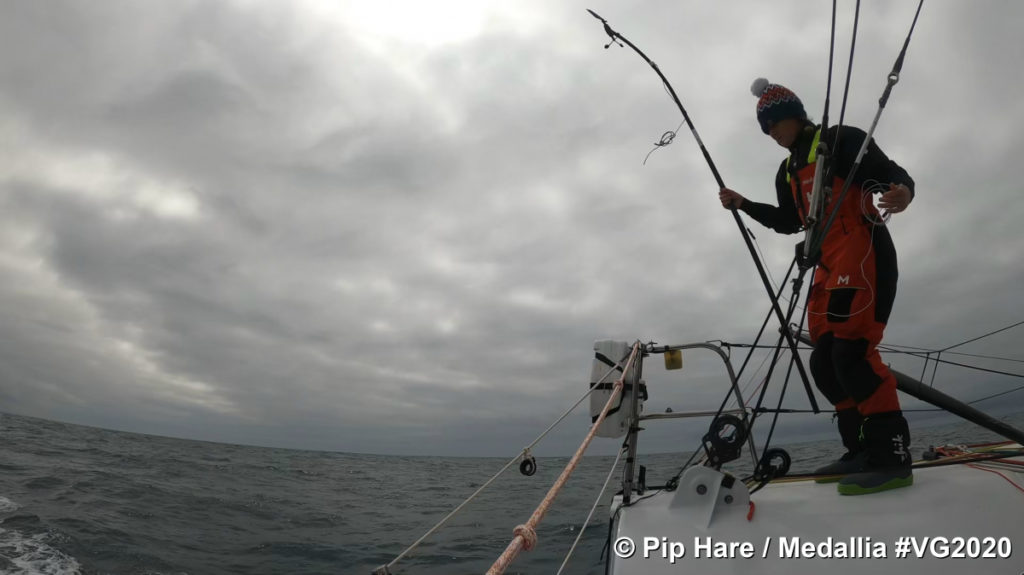 She lost her wind data and was caught be a big weather system. She thinks she has a week of unstable breeze ahead of her, veering between 20-40 knots.
