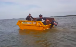 After plugging drainage holes and bolting on a 5hp, two-stroke motor, two marine engineers made a vessel out of a skip.