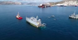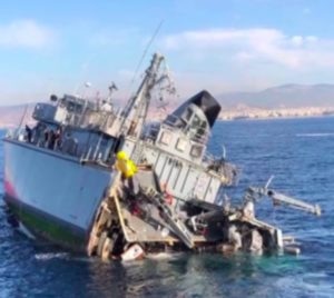 The exact cause of the accident remains unclear, but local media reports described the freighter “passing over” the mine Greek Navy minehunter as the latter was leaving port.