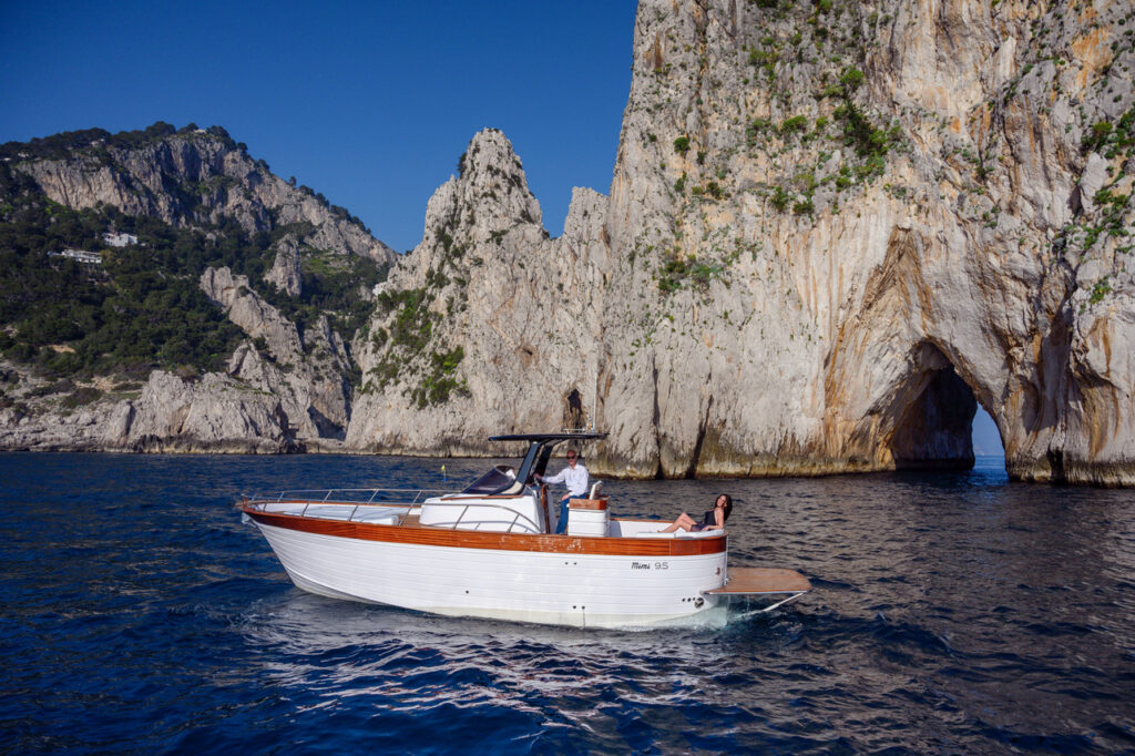 The Libeccio 6.5 Classic (tiller version) and Libeccio 7.5 are two of the first models to be built by Gozzi Mimì and are still very much in demand. They both have a double sun pad in the bow and stern. The 7.5 was the first boat in the open range, and has an ample sun pad covering a spacious cabin.