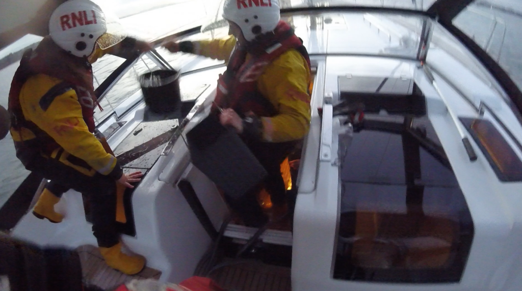 The salvage pump, alongside the crew bailing, helped to keep the ingress under control. As the light was fading, the lifeboats escorted the vessel back through the harbour to Poole Quay Boat Haven.