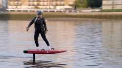Watch as Olympian Amiee Fuller tests a ‘flying surfboard’ on the River Thames.