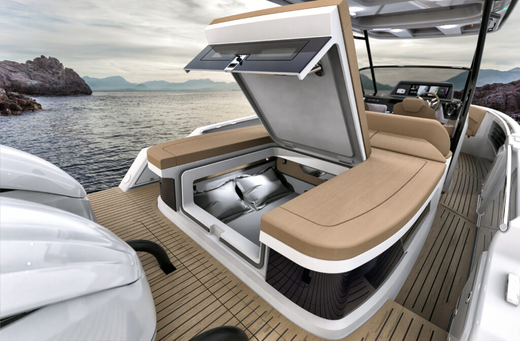 For explorers and adventurers there is the rear cabin version with a well-appointed two berth sleeping cabin and an additional sun deck for relaxing. For overnight trips, the RC version comes with a large sunbed and a cosy cabin with accommodation for two people. A comfortable, private bathroom and large aft platform offer high quality comfort on board.