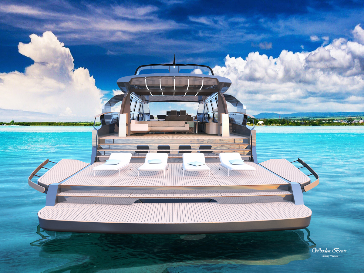 The large terraced aft deck features a fixed swim platform, a large sun bed (with room for stowing a tender underneath) and fold-down bulwarks to increase the deck area and contact with the sea. There is another wide sun bed on the foredeck. Under the enclosed hardtop is a salon with sliding glass doors overlooking the aft deck, a dining area, and the pilot station.