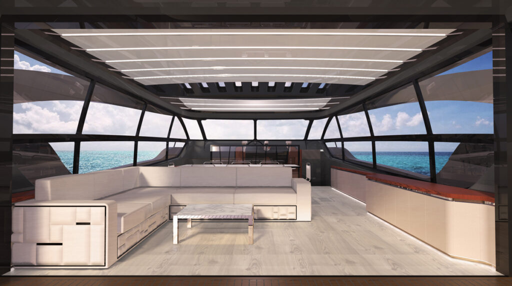 The naval architecture and build methodology draw on naval architect Arnaboldi’s former experience as founder and director of his own shipyards, applying cutting-edge water jet technology and sandwich composite construction to fast-planing yachts.