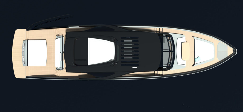 The boat’s profile and deck layout is based on fast shadow boats with a sleek superstructure, open transom and elongated bow.