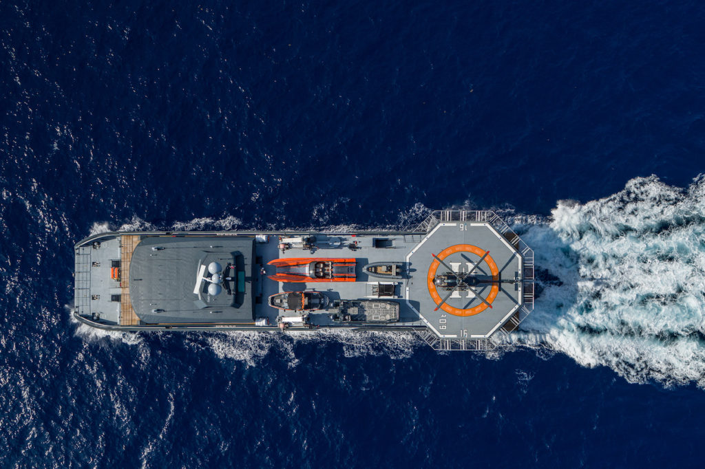 Built on a catamaran platform, Hodor’s 22.5-knot top speed is sufficient to outrun her mothership, making her able to prepare tenders and toys for immediate use when the mothership arrives and, on departure, pack up, overtake, and repeat the process. Hodor carries five tenders, the largest of which has a 17m overall length, and a whole host of toys. There are nine jet skis and four quadbikes, two all-terrain vehicles and two trail motorcycles, and two Laser dinghies and a Hobie Cat. In addition, there is also a submarine that is housed in a garage on the main deck.